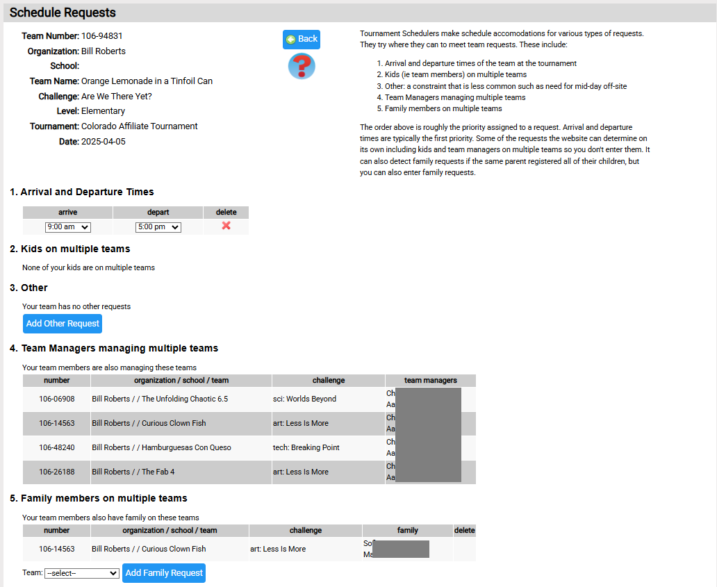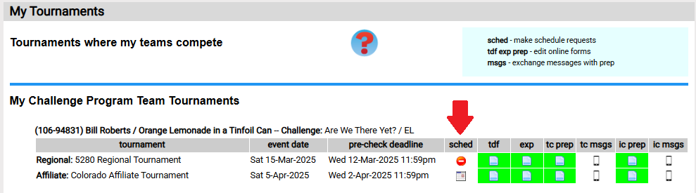 Teams view and enter their schedule requests from Teams=>my tournaments page by clicking on the icon is the sched column for the team. As is illustrated in the screen shot below, you might see a